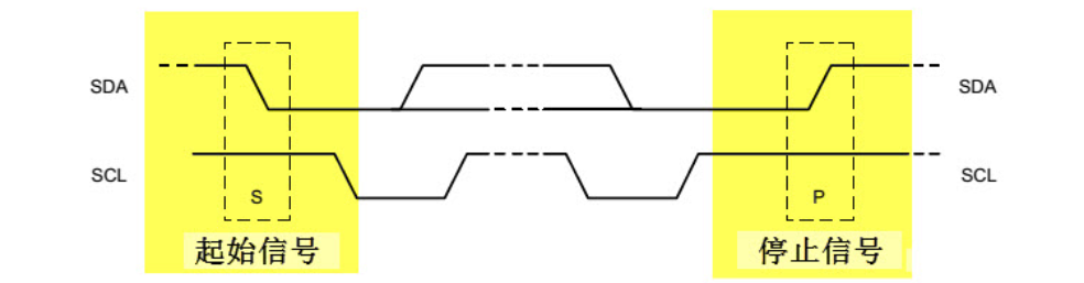 当 SCL 线是高电平时 SDA 线从高电平向低电平切换,这个情况表示通讯的起始。当 SCL 是高电平时 SDA 线由低电平向高电平切换,表示通讯的停止。起始和停止信号一般由主机产生。