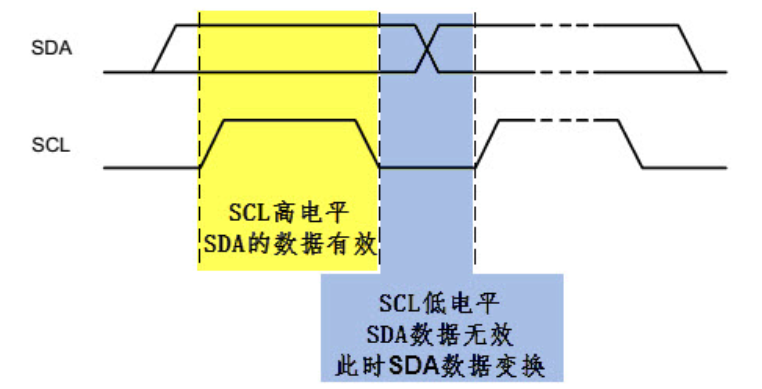 I2C 使用 SDA 信号线来传输数据,使用 SCL 信号线进行数据同步。见图数据有效性。 SDA 数据线在 SCL 的每个时钟周期传输一位数据。传输时, SCL 为高电平的时候 SDA 表示的数据有效,即此时的 SDA 为高电平时表示数据“1”,为低电平时表示数据“0”。当 SCL 为低电平时, SDA的数据无效,一般在这个时候 SDA 进行电平切换,为下一次表示数据做好准备