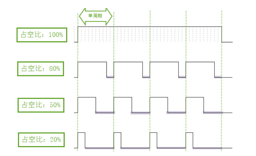 占空比指的就是一个单周期内高电平的持续时间,比如一个周期是1ms,高电平的持续时间为0.5ms,低电平的持续时间也为0.5ms。那么占空比就为50%。在一个周期内高电平持续的时间越长,占空比越大。一个周期内高电平持续时间越长,LED越亮。因此我们可以通过调节一个周期内的高电平时间,就可以控制LED灯的明暗程序。
